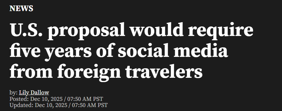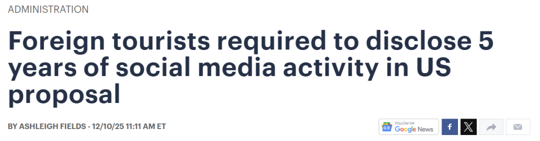 在联邦政府一项新提案下,未来通过洛杉矶国际机场(LAX)等主要入境口岸的旅客,可能面临更大规模的数字化审查——包括要求数百万外国游客提交过去五年的社交媒体纪录。新闻报道截图