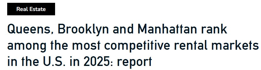 根据房地产平台RentCafe的一份新报告,2025年纽约市皇后区、布鲁克林和曼哈顿租房市场的竞争力均处于极高水平。来源:QNS报道截图