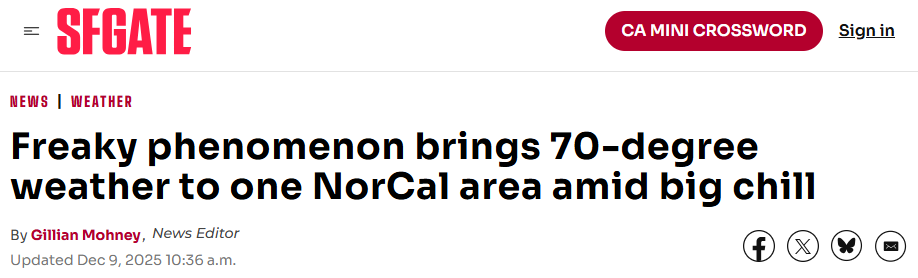 在加州北部和中部大部分地区持续应对寒冷天气之际,温暖的空气抵达沿海地带。包括湾区部分地区在内的多个区域,最低气温仍在30至40华氏度之间。通常沿海温度比内陆更低,但此次在风向与地形共同作用下,沿海地区出现了反向升温。