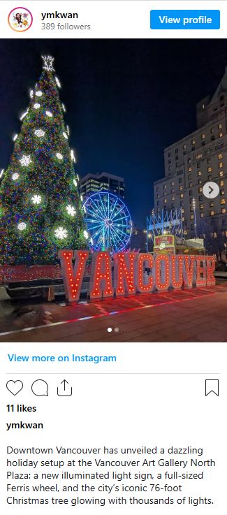 另外温哥华美术馆广场的圣诞树那里,新的“VANCOUVER”巨型标志也亮相了,这个巨型立体发光字母装置不仅比过去两年冬季展出的标志大得多,而且紧邻摩天轮,很多人在这里驻足拍照。
