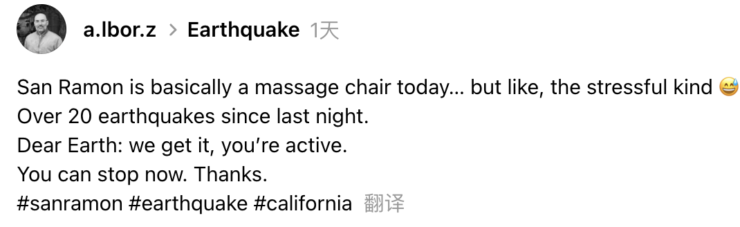 “有点紧张,”一名居民在社交媒体 Threads 上写道,并补充说她计划储备水和地震应急物资。另一个人在社交媒体上写道:“今天的圣拉蒙基本上就是一把按摩椅……但是是那种压力很大的按摩椅。亲爱的地球:我们知道你很活跃。你现在可以停下来了。”