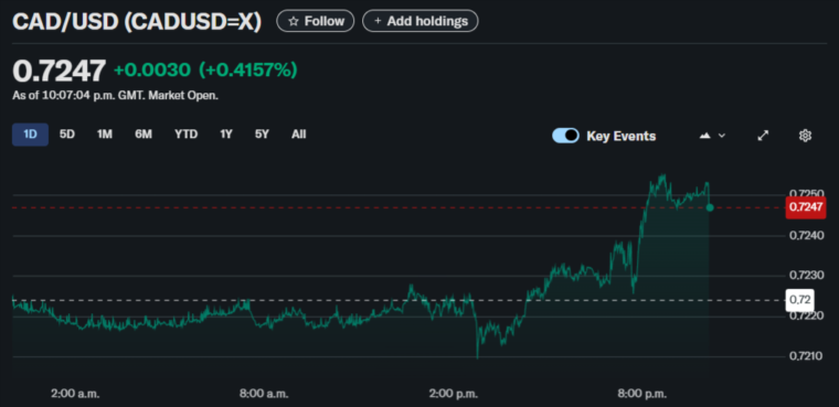 在美联储降息的消息出现后,加元兑美元的汇率出现了逐步升高的趋势,涨幅一度超过0.4%。