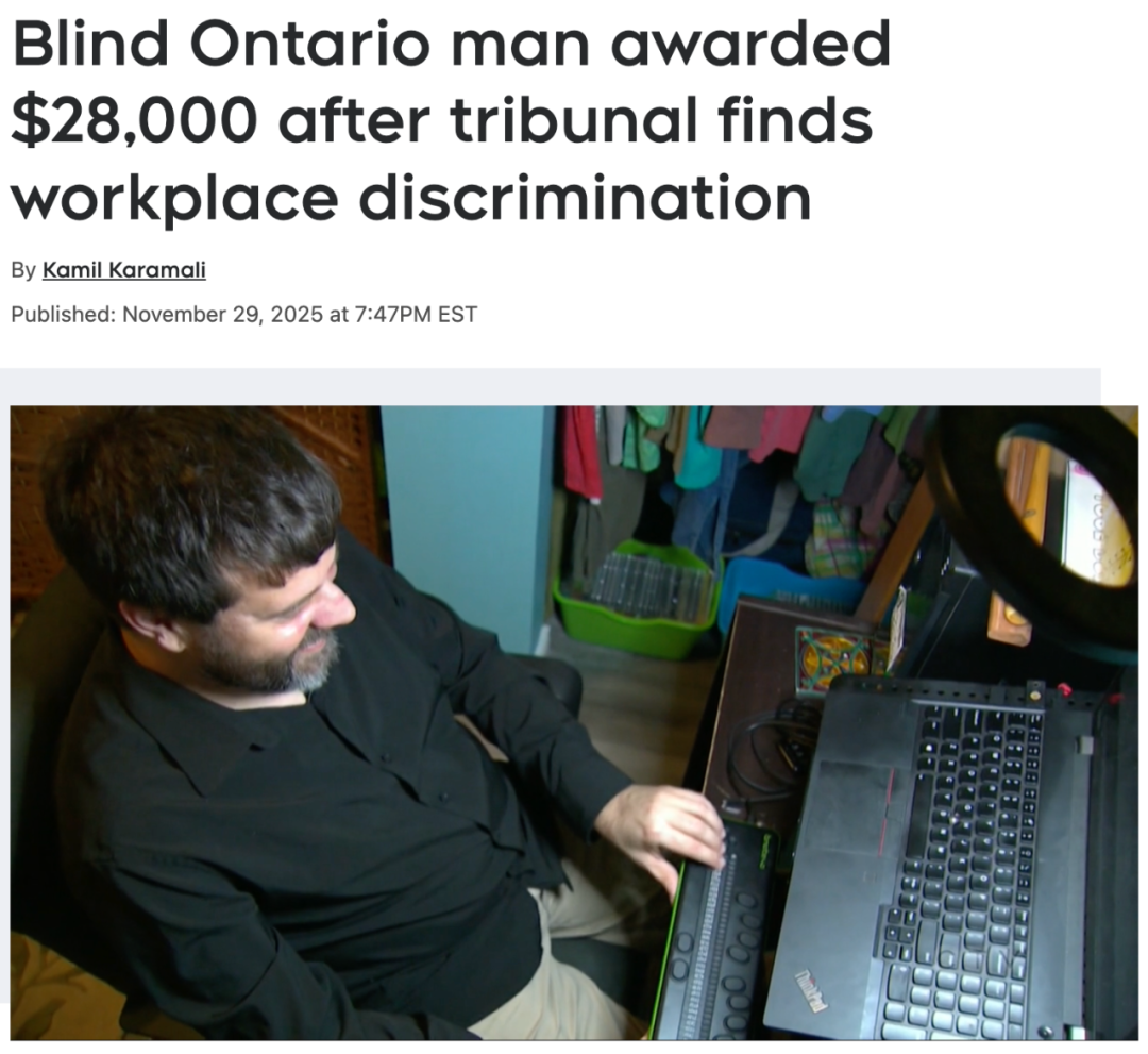 一名来自安省圣凯瑟琳斯市(St. Catharines, Ont.)的盲人男子,在被一家呼叫中心拒绝录用后,将案件提交至安省人权仲裁庭(Human Rights Tribunal of Ontario,HRTO)。历时 8 年,他终于迎来胜利!仲裁庭裁定公司构成歧视,需向他支付超过 2.8 万加元的赔偿与薪资损失。