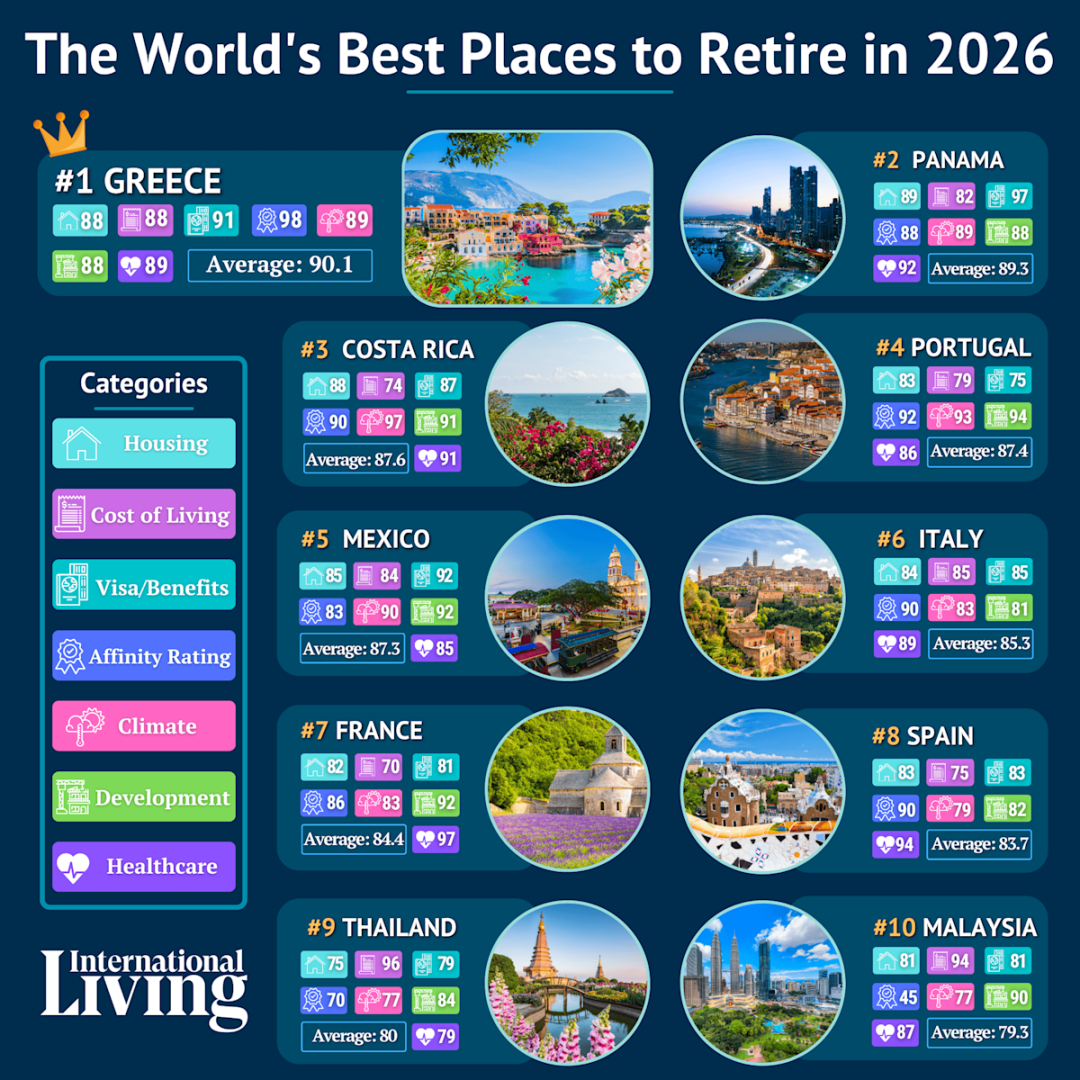 该旅游杂志本月发布了《2026年全球退休指数》(2026 Annual Global Retirement Index),揭示了明年全球十大最佳退休天堂。《国际生活》杂志表示,这份指数不仅仅是排名,更是一套“决策框架”。