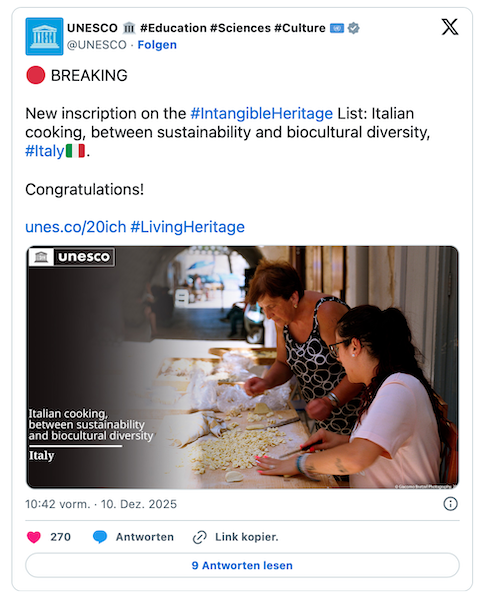 意大利总理乔治娅·梅洛尼对该奖项欢欣鼓舞,她说该奖项是对意大利人及其民族认同的表彰。“因为对我们意大利人来说,美食不仅仅是食物或食谱的集合。它远不止于此:它是文化、传统、劳动和财富。”