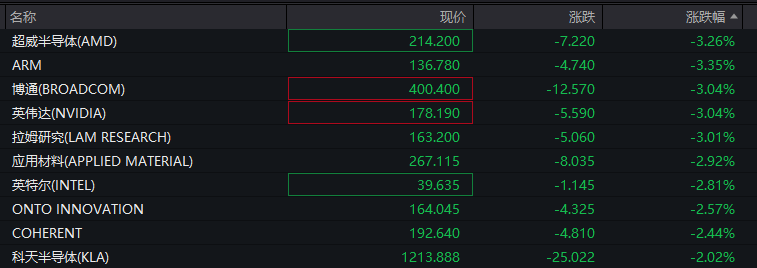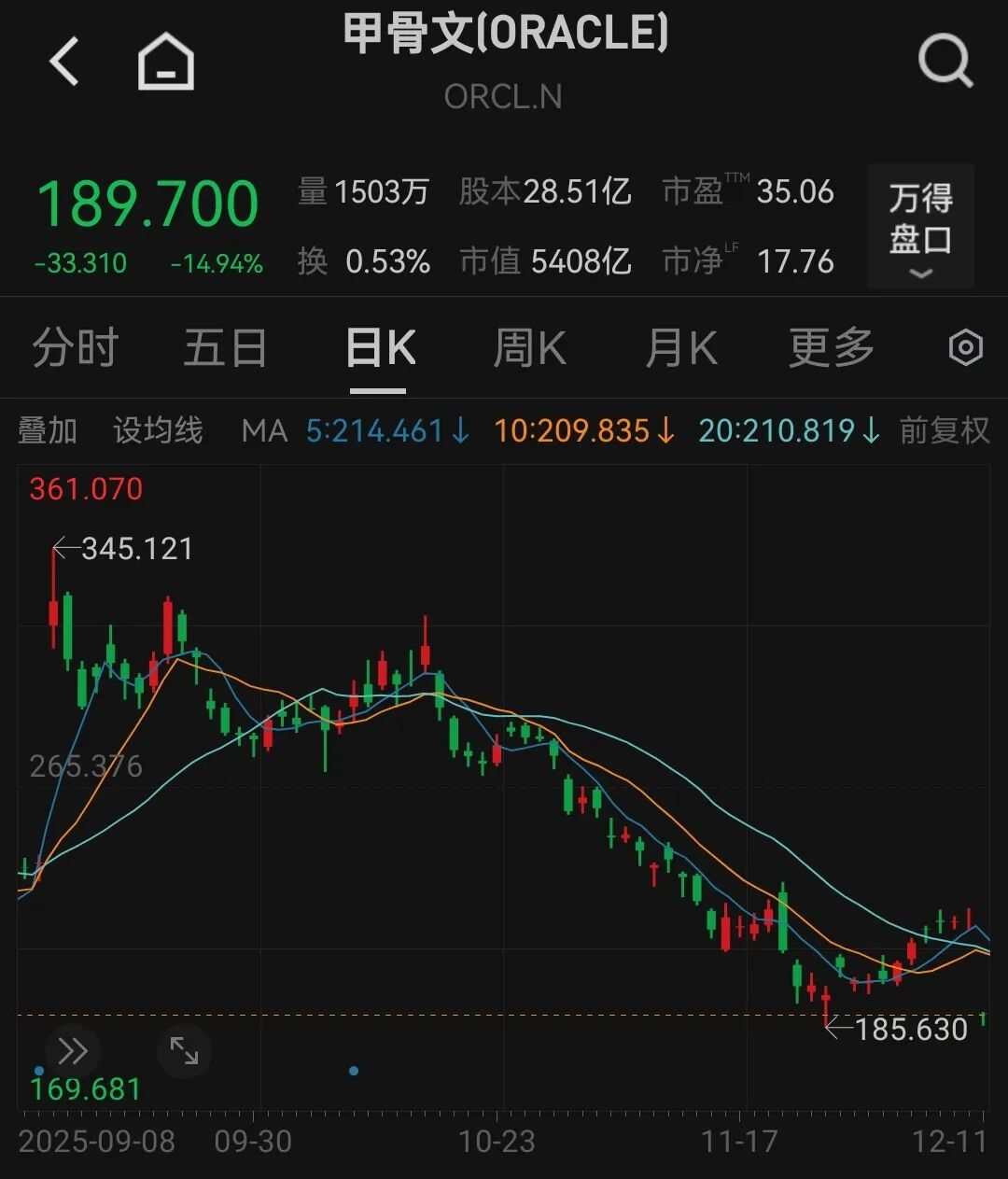 截至发稿,甲骨文股价报189.7美元,大跌近15%,市值约为5408亿美元,市值蒸发约950亿美元(折合人民币6690亿元)。值得一提的是,就在不久前,甲骨文股价两个交易日累跌超14%。受甲骨文拖累,费城半导体指数下跌1.93%,英伟达、ARM和AMD跌幅都在3%以上。