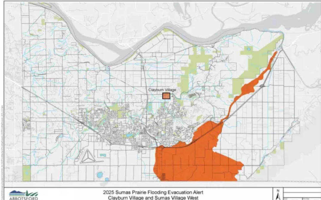 周三下午4点不久,阿伯斯福市政府对苏马斯草原西区(Sumas Prairie West)和克莱伯恩村(Clayburn Village)约1000处房产发布了疏散警报。
