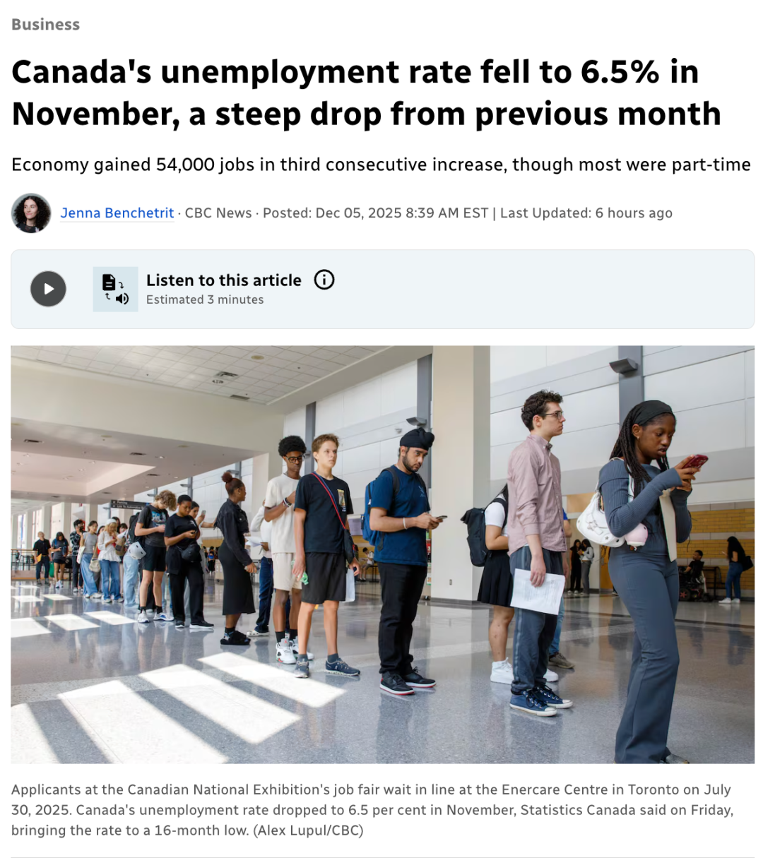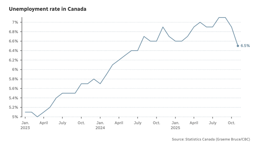 加拿大统计局周五表示,11月份加拿大失业率降至6.5%,创16个月以来新低,经济学家认为,年底降息的可能性不大。失业率在今年大部分时间呈上升趋势后,从 10 月份的 6.9% 下降了几个百分点,9 月份甚至达到了 7.1%——这是自 2016 年 5 月以来的最高水平(不包括 COVID-19 疫情期间)。