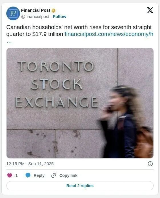 加拿大统计局最新数据显示,今年 2025 年第二季度,加拿大家庭(households)净资产总额涨到 17.9 万亿加元,连续第七季上升。根据《金融时报》的报道,皇家银行(RBC)经济学家Abbey Xu表示,尽管面临贸易政策不确定性和股市波动,加拿大家庭资产负债表仍展现韧性,净值小幅上升。
