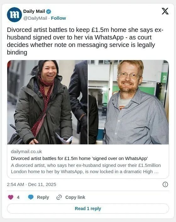 一位离婚的华裔女艺术家称,她的前夫通过 WhatsApp 将他们价值 150 万英镑的伦敦住宅签署转让给了她,如今她正陷入一场戏剧性的高等法院之战,并试图阻止破产管理人强行将她赶出家门。54 岁的萧美琳(Hsiao Mei-Lin)是一名伦敦画家,多年来与冰岛金融家奥杜恩·马尔·古德蒙松(Audun Mar Gudmundsson)一起居住在 Tufnell Park 的这处房产。