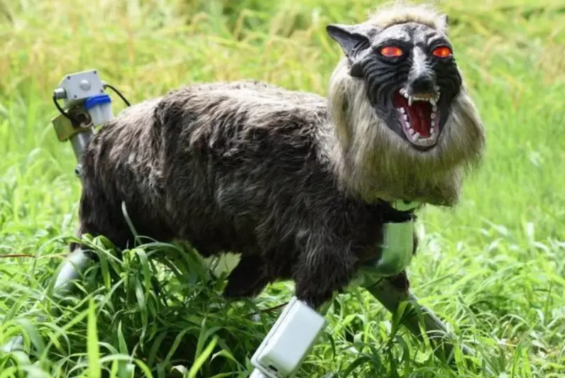 英媒称,这款由北海道一家精密机械公司“Ohta Seiki”研发的“怪兽狼”,通过发出强光、巨响并做出动作来吓阻动物靠近,以保护农田、登山步道等可能出现熊的区域。当动物接近时,“怪兽狼”配备的红外传感器会立即激活——其双眼发出红光,头部开始转动,蓝色LED灯闪烁,并发出像汽车喇叭一样的声响。