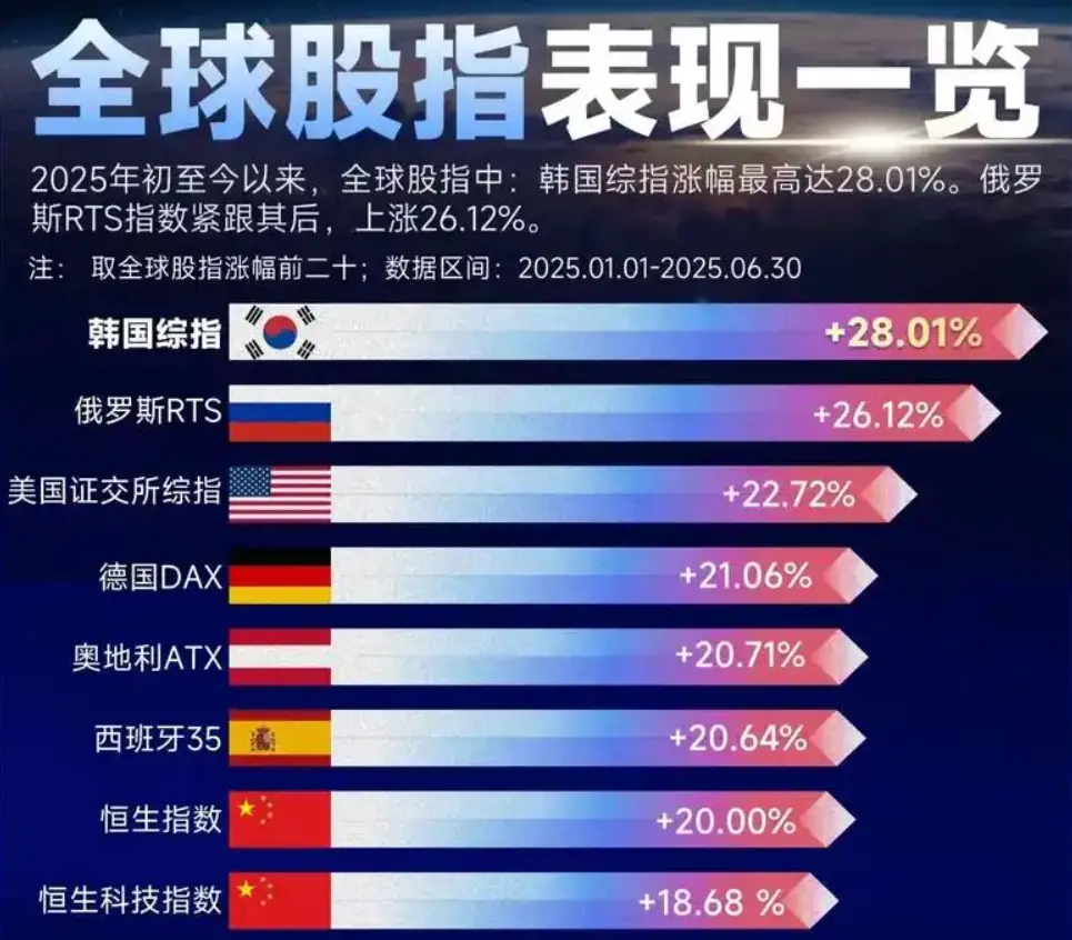 2025年上半年,香港恒生指数涨幅为20%,与德国DAX指数21.06%的涨幅最为接近。