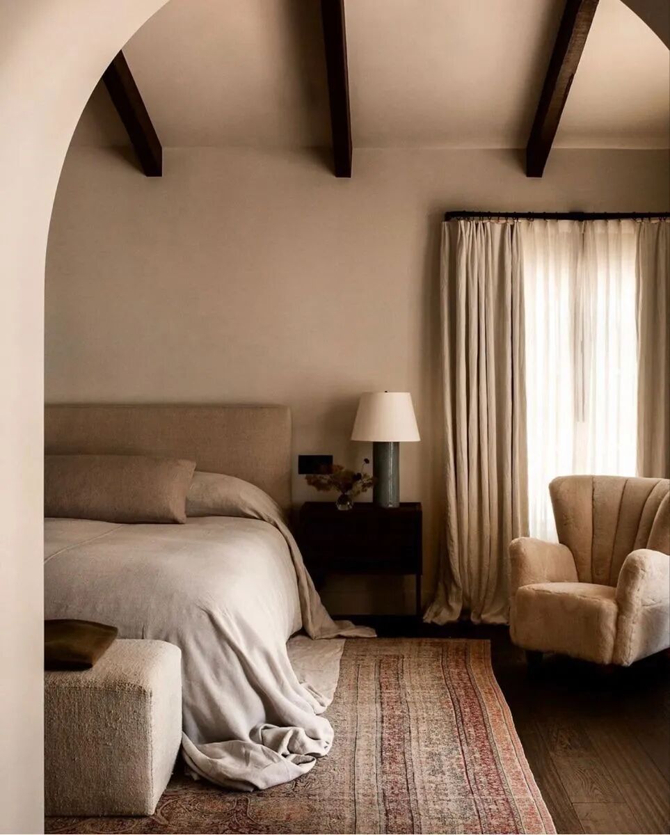 全屋以米色、奶油色、棕色等自然色调为主,营造柔和、中性的氛围。