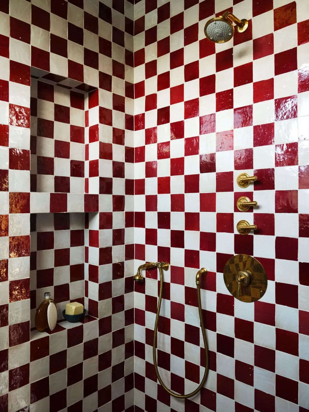肯豆最爱的主浴室,则视觉冲击拉满。红白色棋盘格,搭配金色卫浴,极富戏剧性。肯豆说在这里洗澡很出片很梦幻,但说实话这个红色看久了有点晕,还有点害怕......