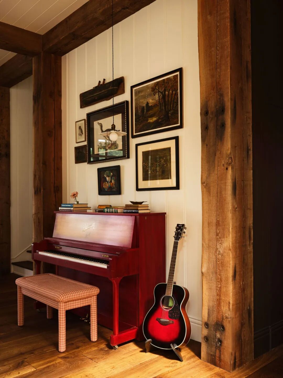 入口处,圆形玻璃窗搭配格子呢软垫,很复古,很怀旧。客厅一角,摆着一架深红色钢琴。肯豆表示红色是她最喜欢的颜色。这抹红不显突兀,反能和斑驳的木材纹理融合,呈现一种红酒的醇厚。
