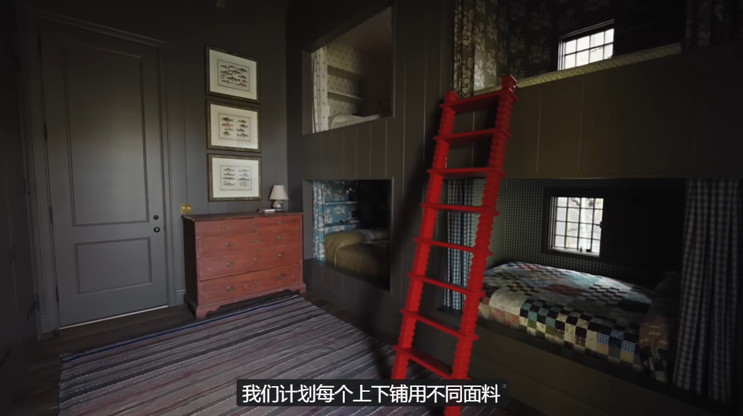 肯豆还在豪宅里准备了很好玩的房间——里面搭建了两组上下床,每张床都是不同的风格,用不同花纹的小床帘分隔出独立空间,成人小孩都能睡,再摆上一个红色的小梯子。“这是给我小外甥们的,可以凑在一起睡觉聊天,我以后的小孩也能住。”但这个梯子看着还挺危险的......