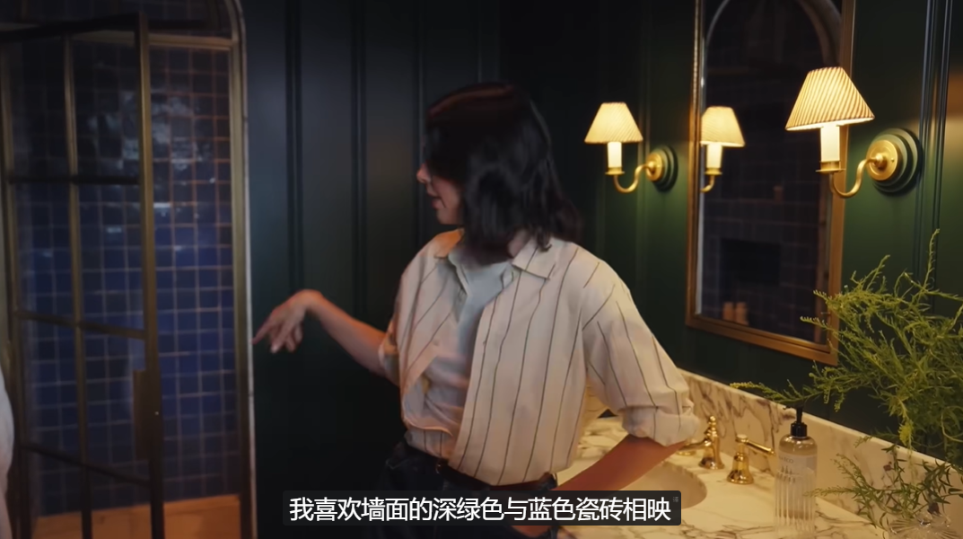 深棕色墙面、浅棕色地板、淡黄色洗手盆、灰蓝色小花瓶,一个小盥洗室,巧妙撞色,恰到好处。另一个浴室,靛蓝色瓷砖、暗绿色墙面,奶白大理石台面又打破了沉闷感,很有心思。