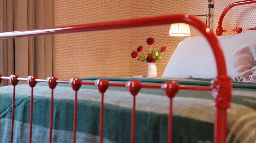 这样大胆的颜色对比,可不止一处。卧室中,采用了高饱和的红绿撞色。樱桃红的床架,搭配水苔绿的被套,再用淡黄色的亚麻色进行平衡,有了趣味,但又不会打破休憩空间的宁静。