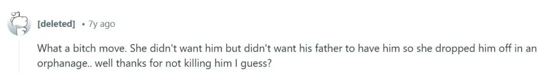 “这种行为真令人作呕,她自己不想要孩子,又不肯交给生父抚养,所以就把他丢进孤儿院……呃,是不是还得谢谢她没把孩子杀了?”