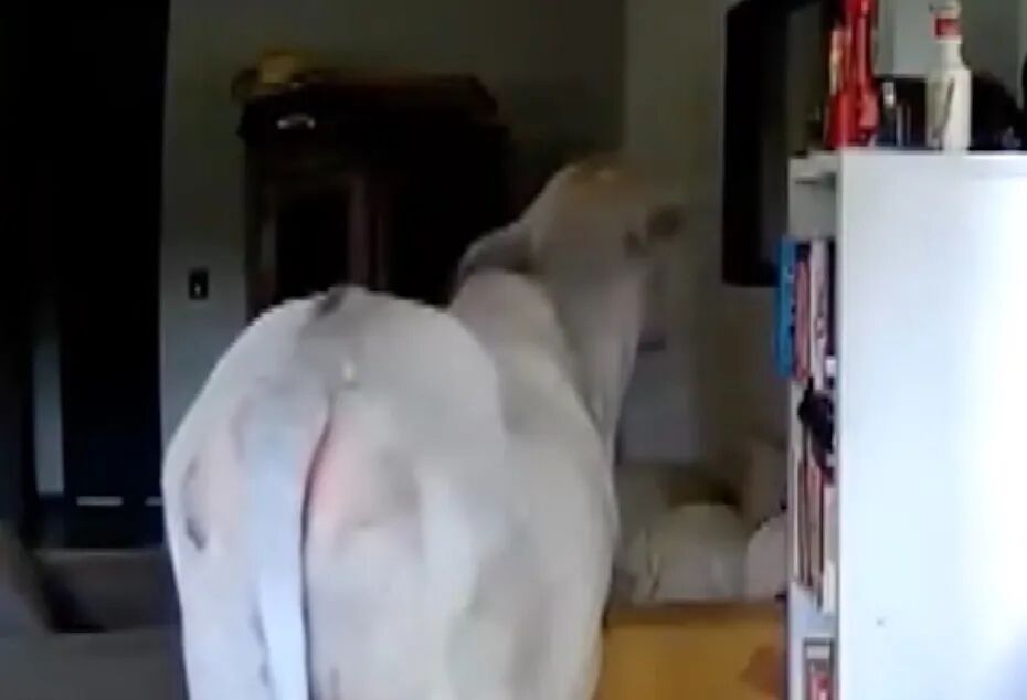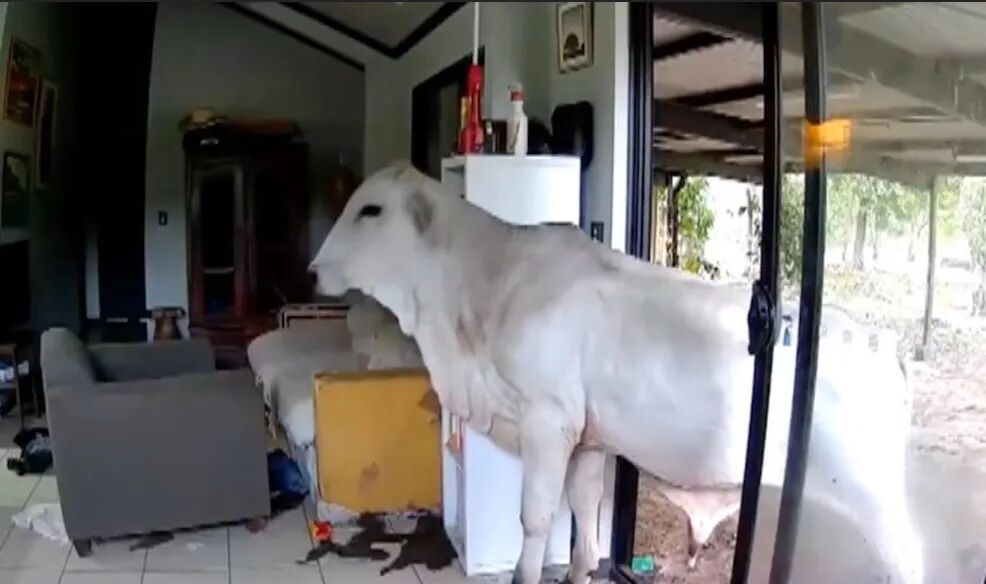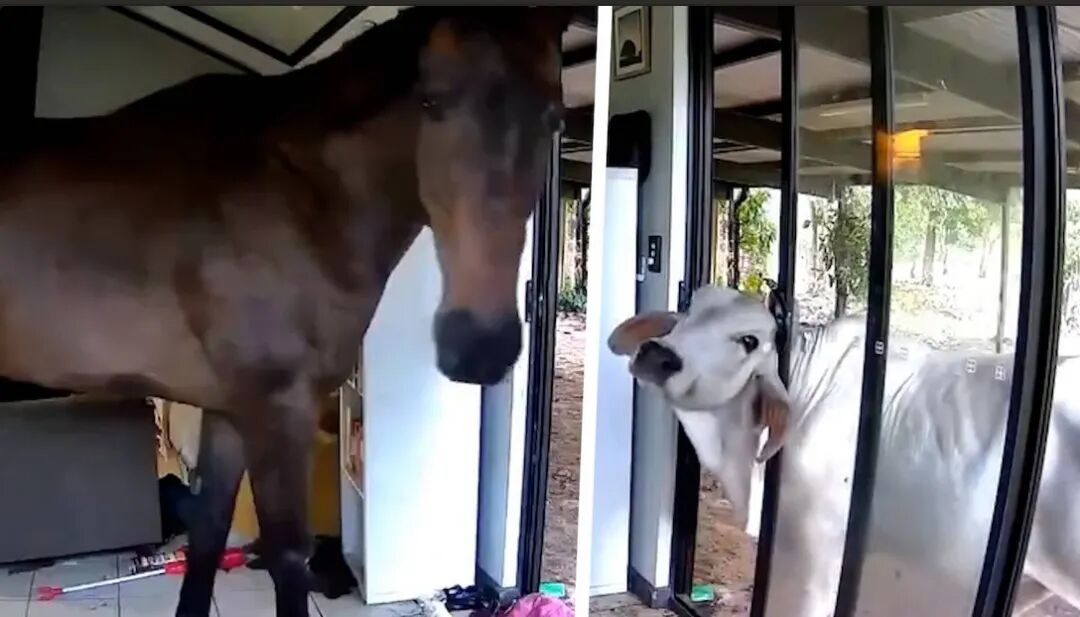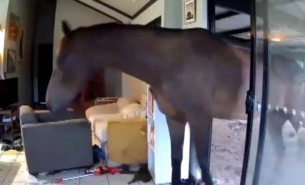原来,家里的狗子等Mackay两口子刚一出门,就用鼻子拱开了客厅的推拉门,将常年养在外面的两只大宠物,18个月大的公牛,以及那匹宠物马放了进来。