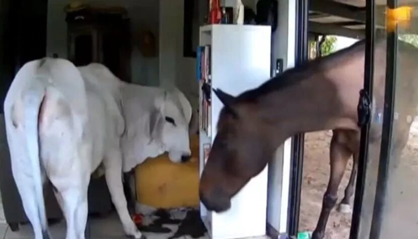 狗子趁主人外出,擅自开门把马和牛放了进来,让这俩常年露宿的伙伴进来享受一下室内派对。