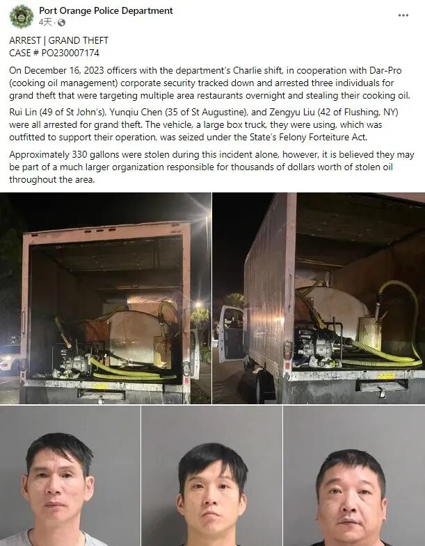 事实上,这并非首次有华人偷“地沟油”被抓,2023年12月,佛罗里达警方逮捕三名涉嫌盗窃餐馆废弃食用油的华人男子,其中一人此前曾因同类犯罪被捕,被认为与一个有组织的地沟油盗窃团伙有关(详情点击:三名华人偷地沟油被抓!被以重大盗窃罪起诉)。