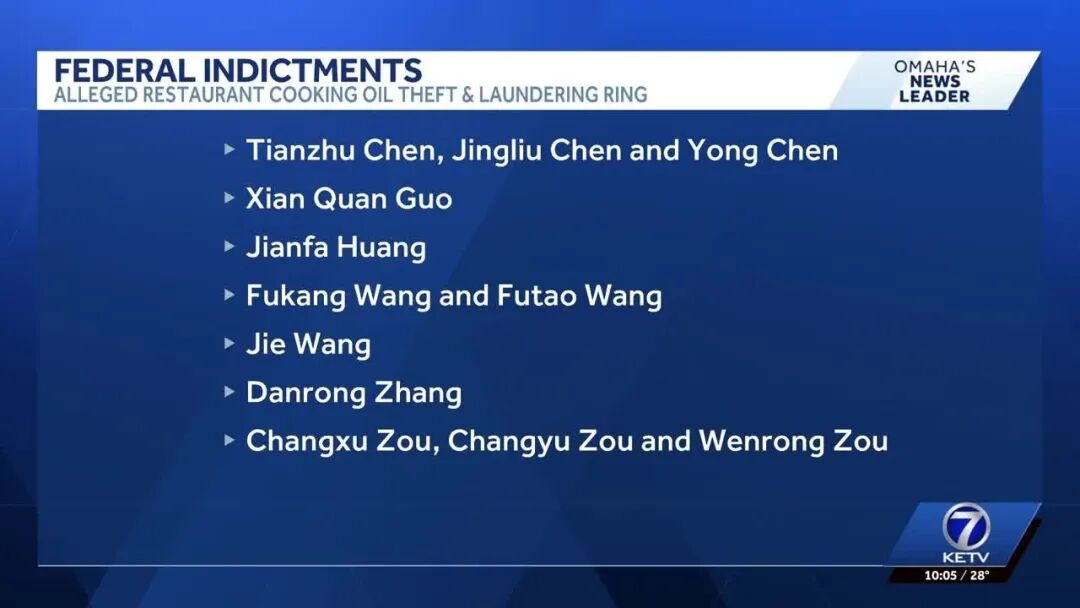 根据联邦起诉书披露,该团伙被指控系统性地从多州餐馆非法盗取废弃食用油,并通过复杂的跨州物流和资金流转网络,将赃物出售牟利。据了解,这些废弃食用油并不是用来提炼成食用油,而是用来提炼生物柴油,在能源市场具有较高经济价值。