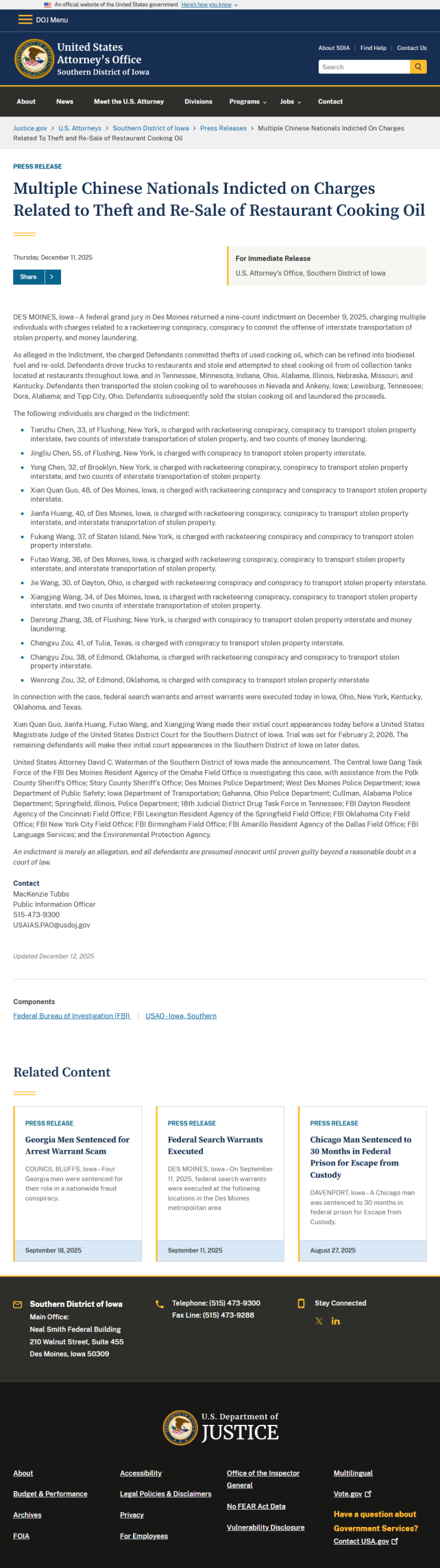 王福涛(Futao Wang,音译)36岁,爱荷华州得梅因居民,被控敲诈勒索阴谋、跨州运输赃物阴谋及跨州运输赃物罪;