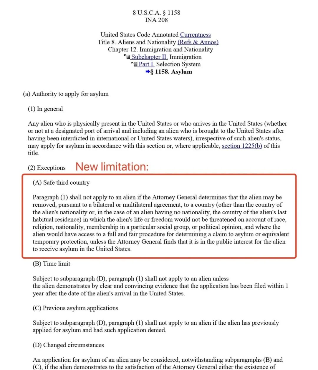 根据 INA §208(a)(1),任何身处美国境内、或抵达美国的外国人,不论其入境方式是否合法,原则上都“可以”申请BH。然而,同一条款的 §208(a)(2) 明确列出了若干“例外”,其中最关键的一项,正是 “第三安全国”条款。