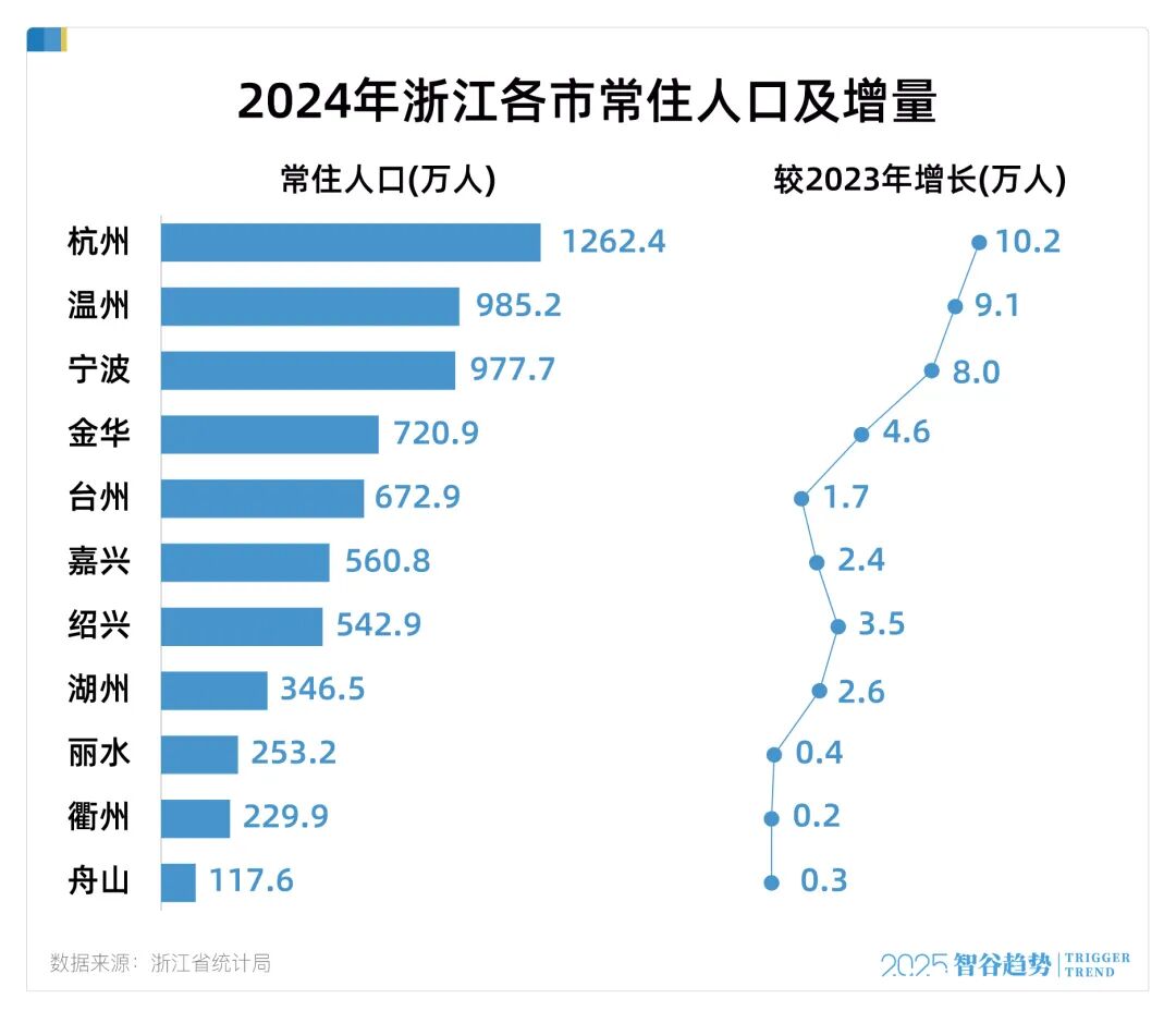 从杭州、宁波到温州、绍兴,乃至舟山、丽水,全省所有城市的人口都实现了正增长。这种“全域增长”的局面,展现出经济活力在全省范围的均匀渗透,而非仅仅依赖一两个中心城市的辐射。