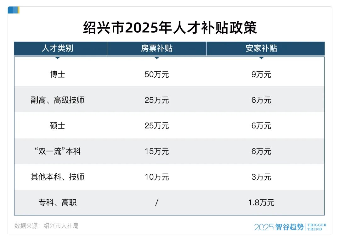 大专生都这么抢手,本科和硕博人才就更是“VIP待遇”。以绍兴为例,普通本科生3万元安家补贴,“双一流”本科生6万元,硕士6万元、博士9万元。