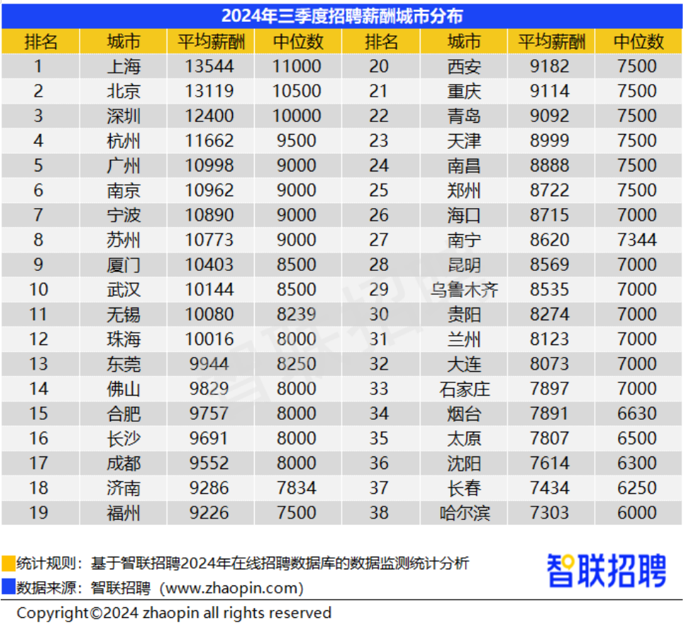 根据智联招聘发布的《中国企业招聘薪酬报告》,2024年第三季度,杭州职场平均薪酬高达11662元、薪酬中位数是9500元,均为全国第四,在省会城市里排名第一;宁波职场平均薪酬为10890元,排名全国第七。