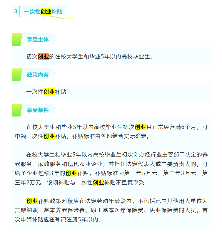 毕业5年以内高校毕业生,初次创办经行业主管部门认定的养老服务、家政服务和现代农业企业,并担任法定代表人或主要负责人的,可给予企业连续3年的创业补贴,补贴标准为第一年5万元、第二年3万元、第三年2万元。