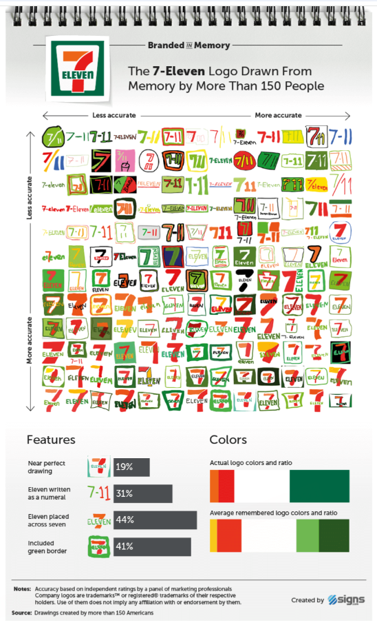 “小n”同时也为7-11变相引流不少。Signs网站曾经举办过一个活动,招募了 156 名年龄从 20 岁到 70 岁不等的美国人参与绘画实验,让他们仅凭记忆绘制了10个容易记错的大众品牌标志。7-11标志的绘画结果可谓千奇百怪,这156 人中只有两人(约 1%)能正确记住“小写n”这个小细节[16]。