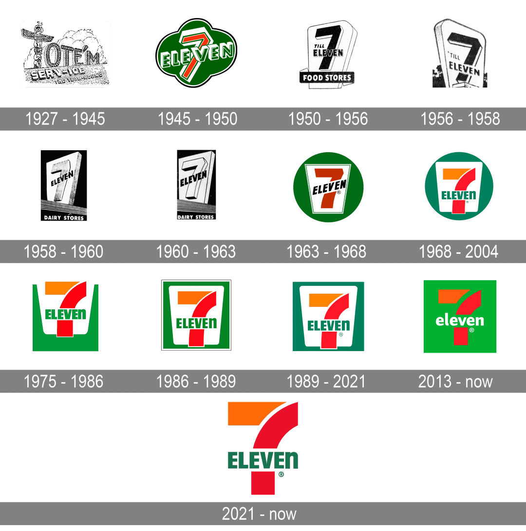 在这次变革后,7-11的标志就基本定型了,和我们现在看到的logo大差不差。这之后的几十年里,无非是对“7”字后面白色梯形的位置、绿色背景的色调、“7”和“ELEVEn”的高度做一些微调。