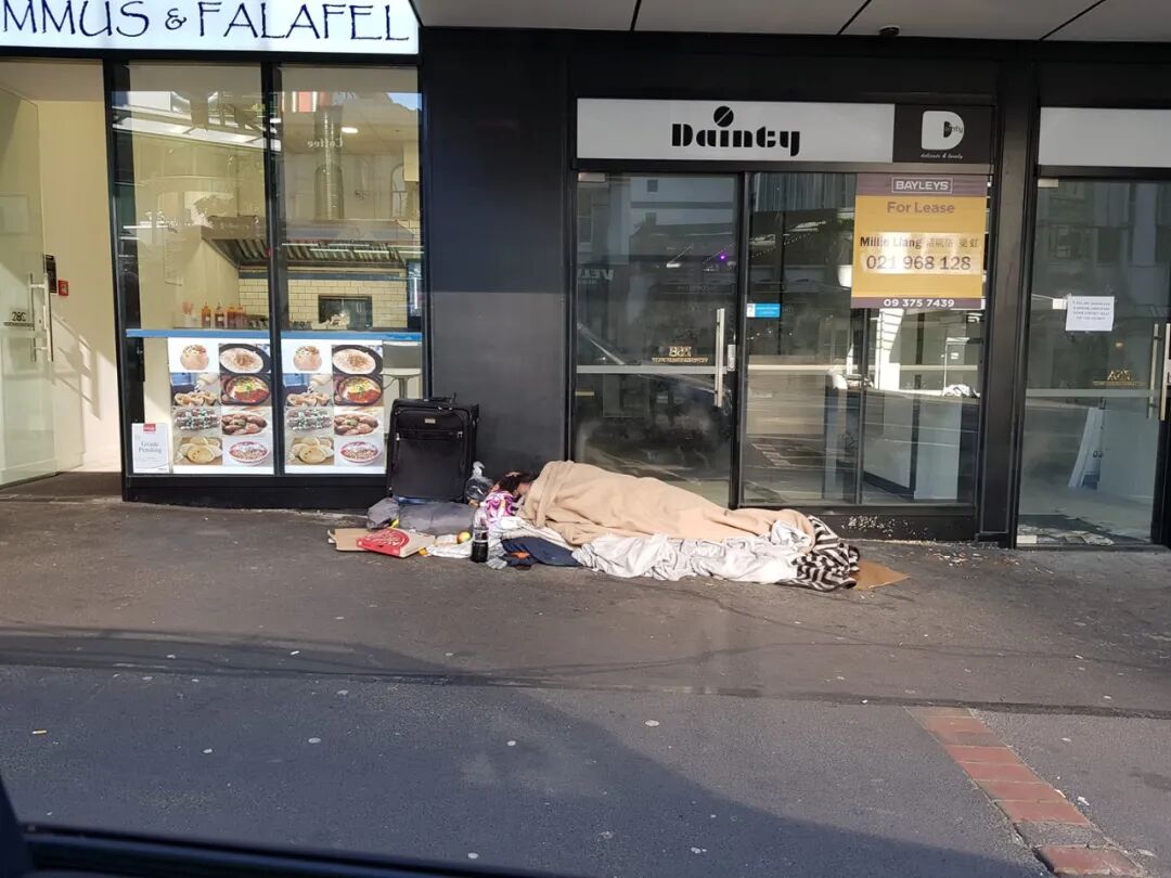 最新调查显示,过去一年内,奥克兰无家可归人数从426人激增至940人,增长超过一倍。与此同时,一线工作人员警告称,心理健康恶化、紧急住房被拒率飙升,正在将越来越多弱势群体推向更深层次的社会危机。Hobson Street 的无家可归者。华页摄影