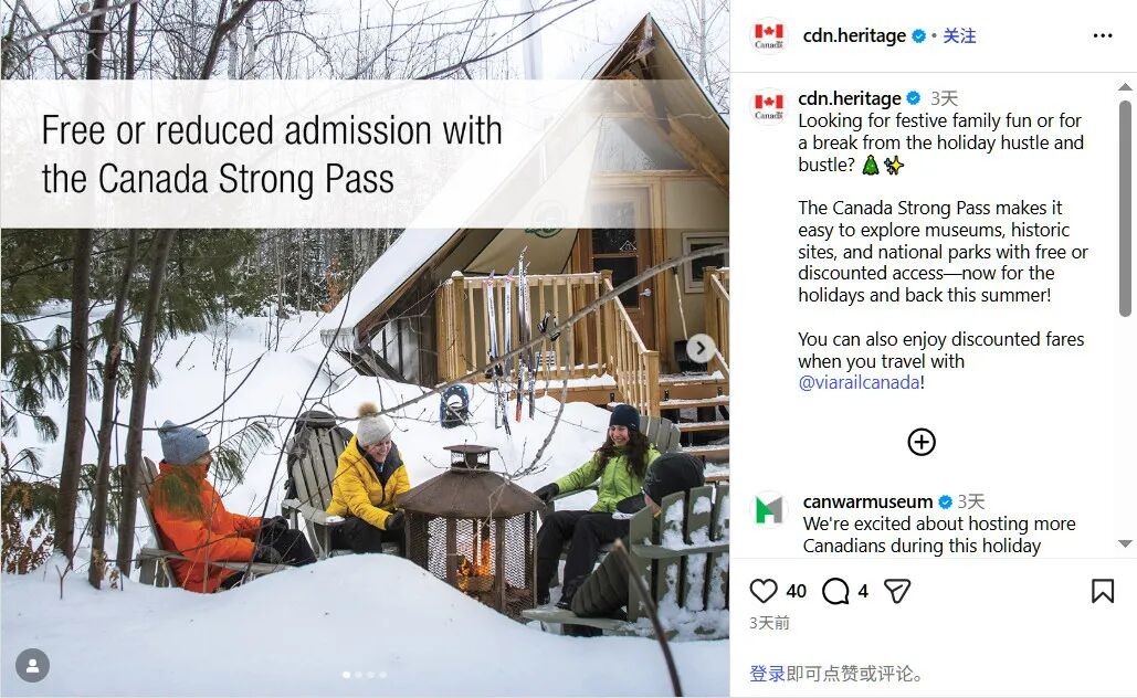 加拿大强力通行证计划 (Canada Strong Pass) 在今年夏季取得了巨大成功,联邦政府宣布将该计划延长至今年冬季。从 2025年12月12日至2026年1月15日,参观国家公园、美术馆、博物馆,甚至乘坐火车时,都可以再次享受免费或折扣优惠。加拿大强力通行证计划于今年6月20日首次启动,持续至9月2日,“加拿大强力通行证”并非实体通行证,只需在参观任何参与此计划的加拿大公园管理局(Parks Canada)运营的国家公园、博物馆和美术馆,或者乘坐加拿大铁路公司(Via Rail)的列车时,就能立即享受免费或折扣优惠。