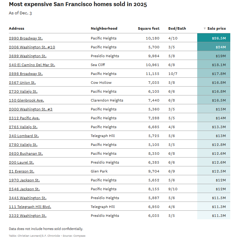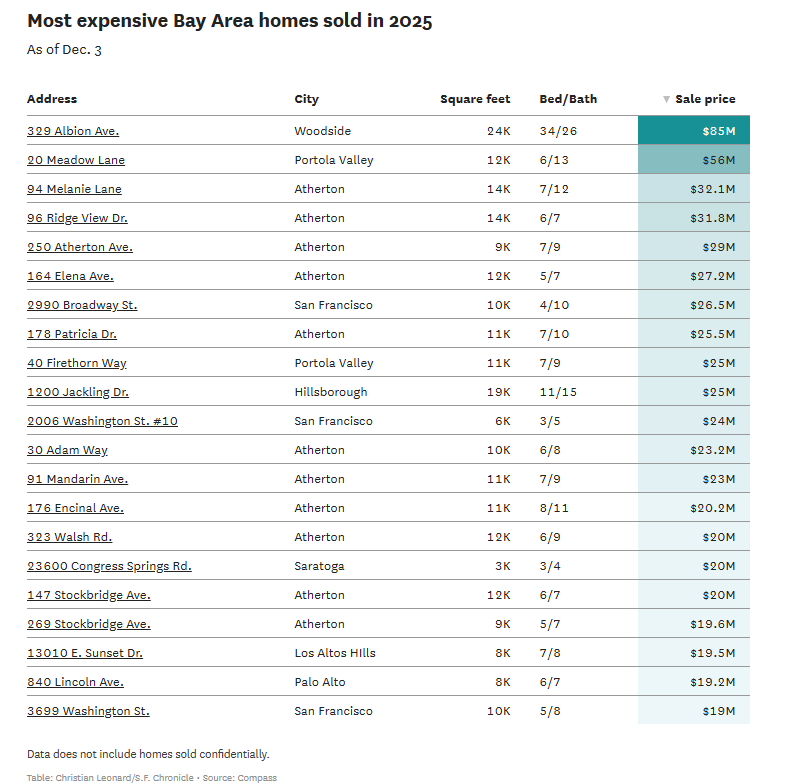 这并非湾区今年唯一一笔八位数交易,因为湾区拥有美国一些价值最高的房地产。Compass数据显示,截至12月3日,旧金山太平洋高地(Pacific Heights)一处成交价为2650万美元的豪宅,是该地区金额第七高的公开交易。该经纪公司的记录不包括场外交易,例如去年10月,旧金山Billionaires’Row一处豪宅以4200万美元的价格售出。