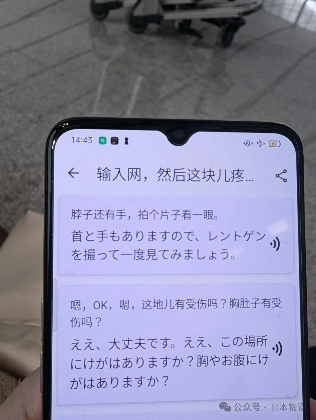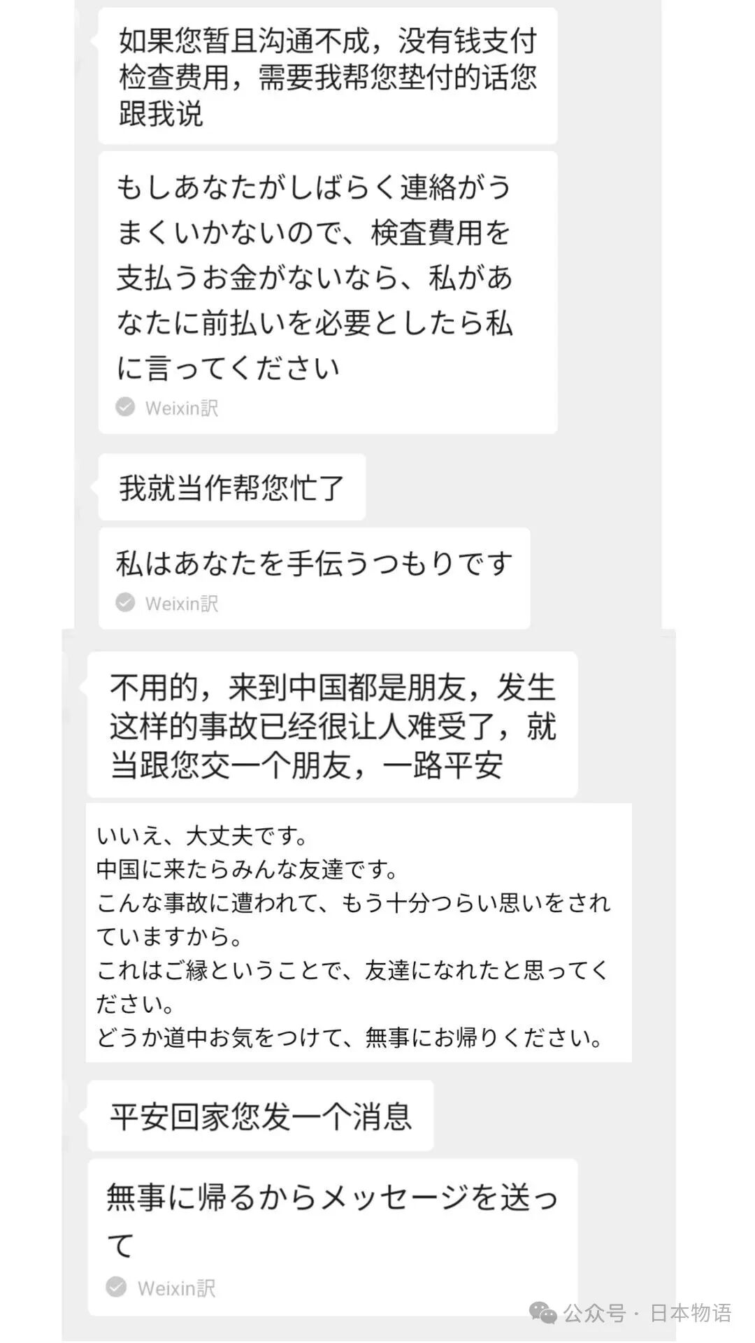 在医院期间,因为信用卡额度不足,无法支付检查费时,一位负责处理事故的工作人员通过翻译软件说:“如果你暂时沟通不成,没有钱支付检查费用,需要我帮忙垫付的话跟我说。”