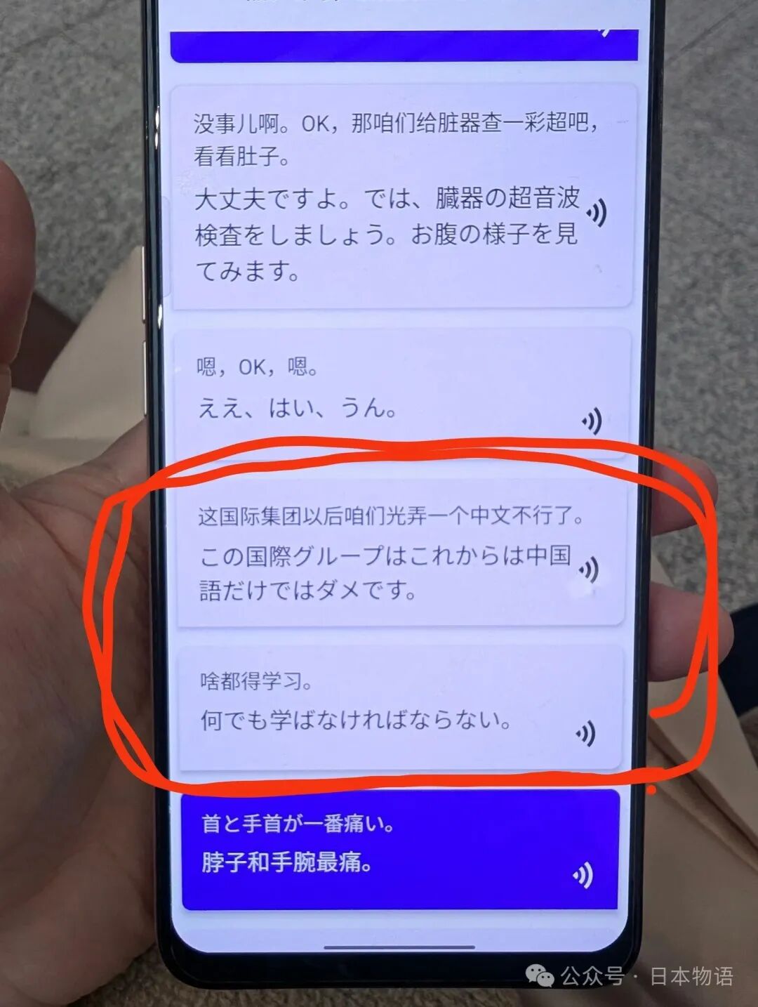 她的翻译机还偶然捕捉到了医生们写病历时的小声交谈:“这里是国际医院,光说中文不行,必须更加努力学习。”她说,中文的语调听起来有时会觉得生硬、直接,但实际内容是在认真讨论如何更好地对待患者,“像是在开一个小型的反思会”。她写道:“至少,我看到的医疗现场,是诚实的、认真的、非常温暖的。”