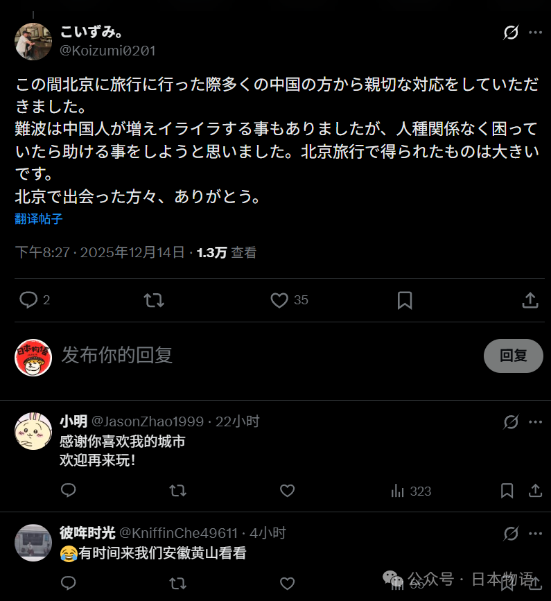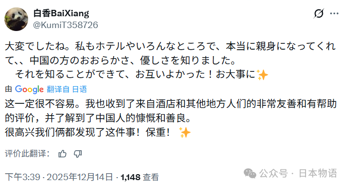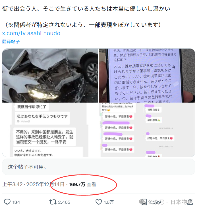 12月14日,在X平台上,一位来自大阪的日本姑娘讲述了她到中国旅游期间遭遇车祸,受到中国人友善帮助的故事。短短2天时间,这条帖子阅读量就超过166万,获得1.6万点赞、2400多次转发。很多人说,看完后对中国的印象完全变了。