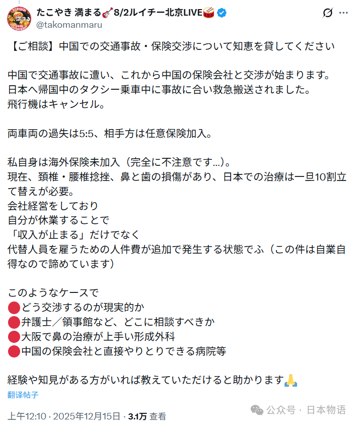 不过在昨日,这位日本姑娘在X上表示,因为她没有买“海外保险”,所以回日本后的治疗费用都由自己承担了。她的章鱼丸子店休业意味着收入中断,还要雇代替人员,增加人工成本。因此她希望得到有经验的网友帮助,如何与中国的保险公司对接,或者可以通过哪些途径解决后续的医疗费用问题。她说,不买保险是自己的疏忽,其他的损失也是自作自受,都认了,但后续的保险和治疗,真的需要帮助。