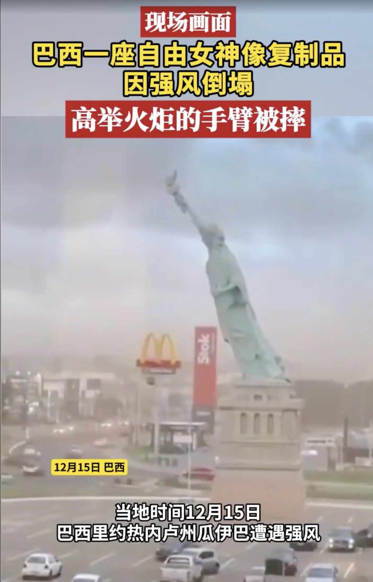 据凤凰卫视报道,12月15日,巴西南里奥格兰德州瓜伊巴市,一座高约24米的自由女神像复制品在强风中倒塌,高举火炬的手臂被摔碎。
