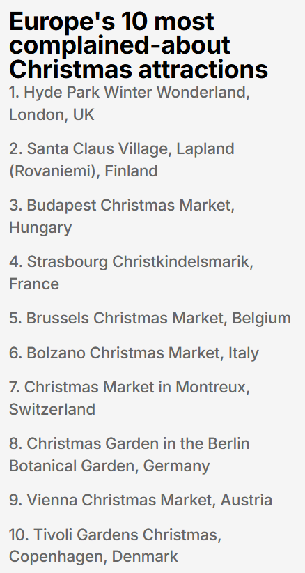 就在最近,国外知名数据机构 Nomad eSIM 深入挖掘了成千上万条 Tripadvisor(猫途鹰)上的真实游客评论,为大家揭开了一份“欧洲最差圣诞景点排名”。这其中,不少我们耳熟能详的网红地标赫然在列,原来,童话里不仅都是骗人的,还可能是来抢钱的。