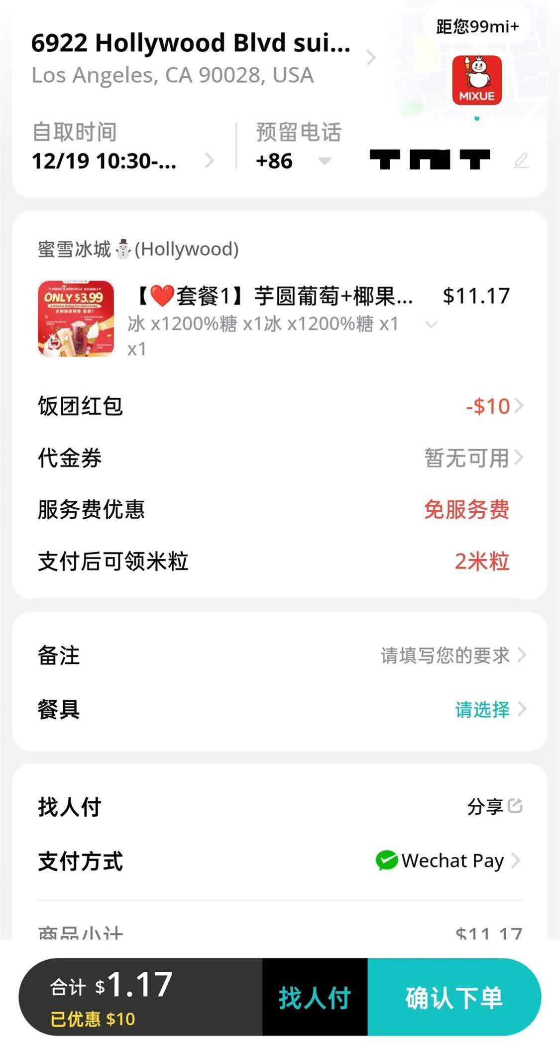 值得一提的是,线下门店尚未正式营业,但外卖平台已经可以提前点单了。饭团外卖APP显示,美国版蜜雪冰城共有两个套餐,都是两杯奶茶/果茶,外加一个冰激凌,售价3.99美元(约合28元人民币),有8种甜度可选,从不另外加糖到200%糖。12月19日至21日,消费者可到线下核销领取,支持微信支付宝支付。