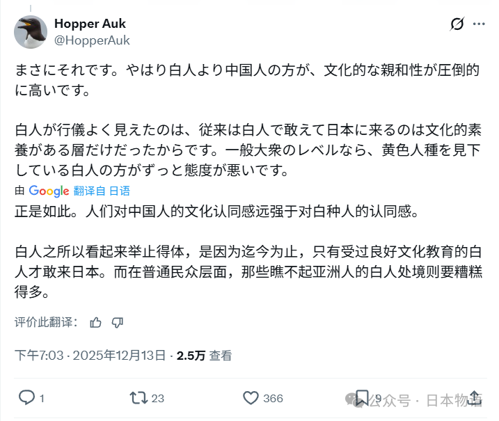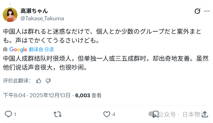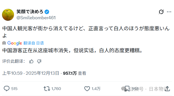 12月13号,日本社交媒体上一场关于“游客素质"的讨论,走向了始料未及的方向。起因是一位大阪女网民的随口吐槽。她声称自己是工厂职工,说话直来直去。在社交平台上,她发了一条短短的状态:"街头的中国游客少了,但老实说,西方游客的表现更让人头疼。"