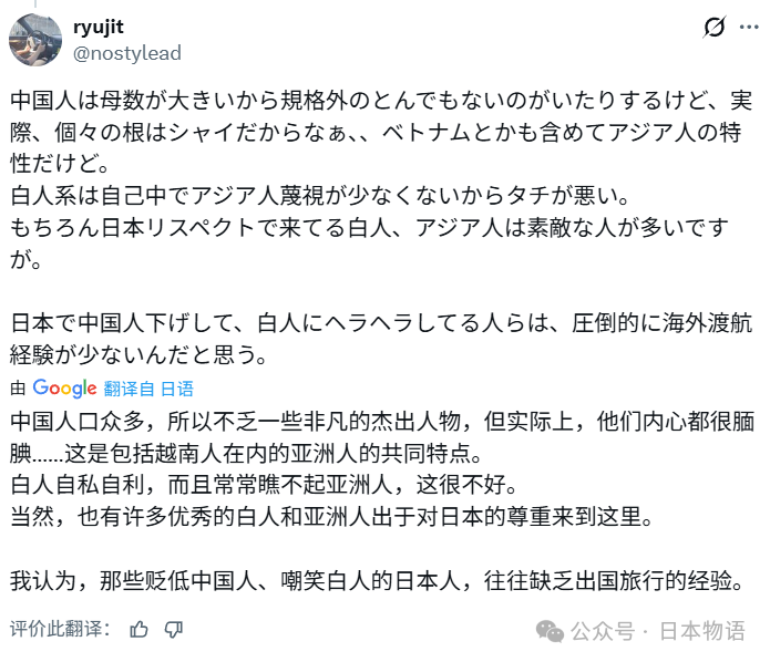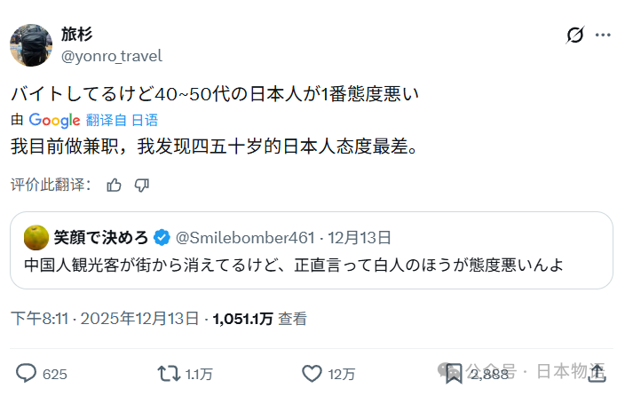 就在关于西方游客的讨论正热时,一位粉丝数不到千人的日本旅游博主转发了那条热帖,并附上了自己的评论:"我在服务业做过兼职,依我观察,40到50岁的日本男性才是态度最差的群体。"