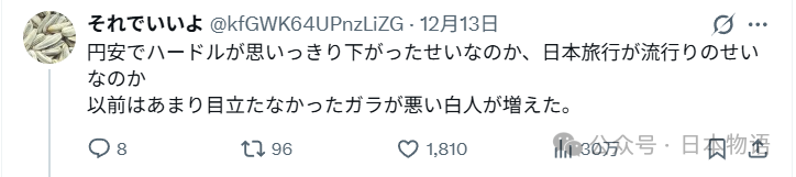 一位自称是"居日白人"的用户留言说,他完全理解日本人的观感变化。“一些西方游客来到这里,就像进了主题乐园,觉得什么都新鲜好玩,却忘了这里是别人生活的地方。"