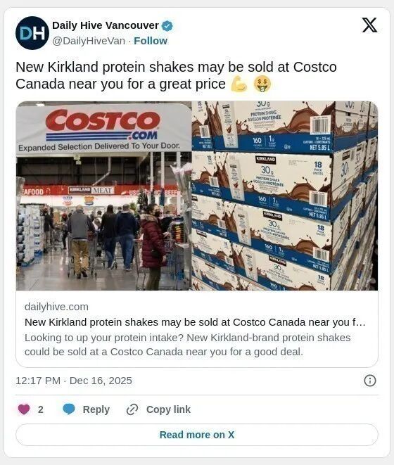 加拿大消费者注意了!想增加蛋白质摄入,又希望节省购物开支?新款Kirkland品牌蛋白质奶昔可能在你附近的Costco有售,而且价格相当优惠。据dailyhive的报道,Reddit用户在网上分享,这款新蛋白奶昔每瓶含30克蛋白质,每瓶热量160卡,糖分仅1克,一包18瓶售价29.99加元,相当于每瓶约1.60加元。