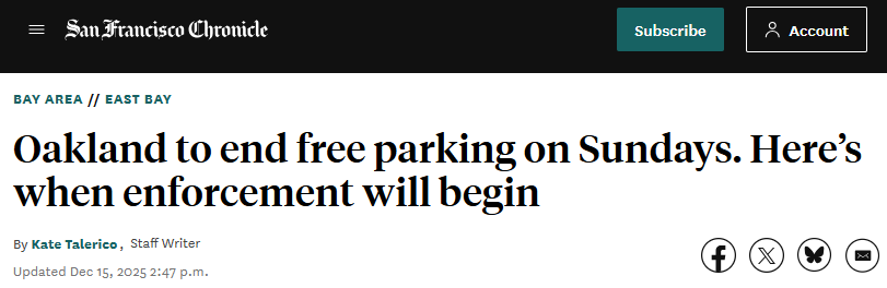 奥克兰此前曾于2023年在梅里特湖(Lake Merritt)附近试行周日停车执法,对中午至晚上8点的停车进行收费。